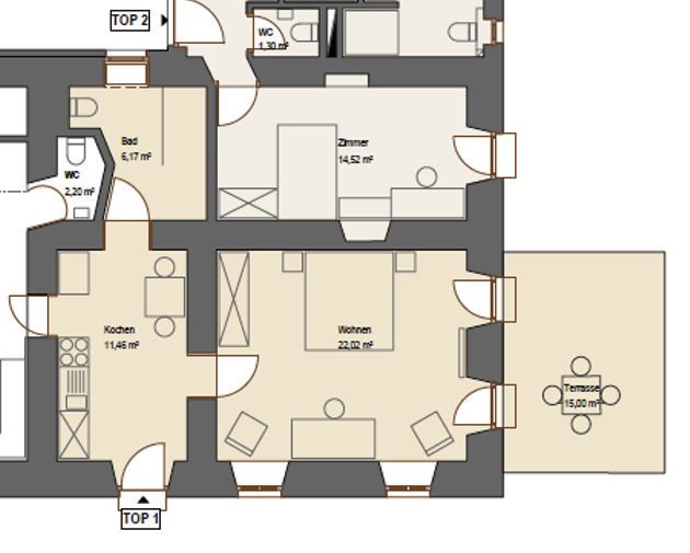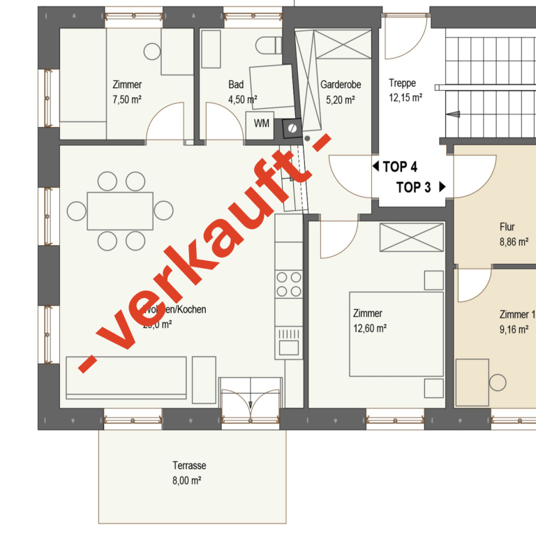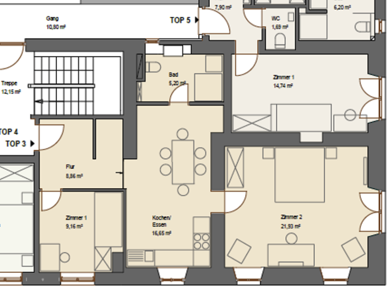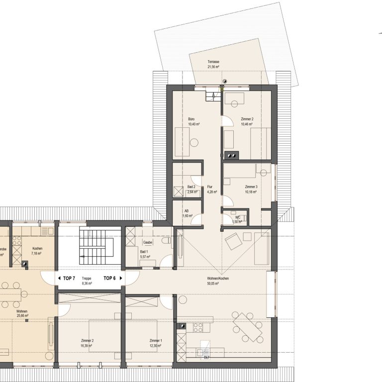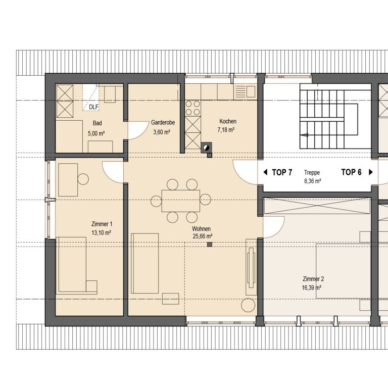 Diese Wohnung ist die kleine Schwester von TOP 6, mit dem ebenso grandiosen Wohnraum und dem offenen Dachstuhl mit 4 m Raumhöhe. Licht durchflutet die Wohnung von Ost nach West, der Blick reicht vom Dobratsch bis zu den Lienzer Dolomiten. Und natürlich hat auch diese Wohnung einen Balkon.