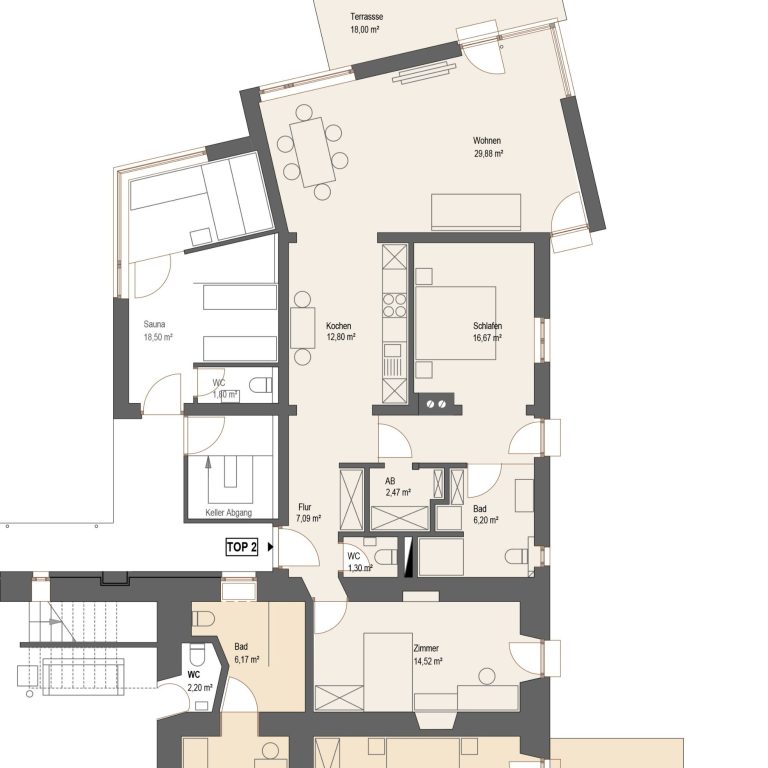 Die Wohnung befindet sich im ehemaligen Stadel und erhält besonderen Charme durch die 8 großen traditionellen Ziegelfenster (1,20m x 2,10m), die an der Nordseite vollständig erhalten werden konnten. Die freitragende Holzverbund-Decke in einer luxuriösen Raumhöhe von 3,35m im Großteil der Wohnung vermittelt ein herrschaftliches Wohngefühl. Eine großzügige Terrasse auf dem Gründach erweitert den Wohnbereich.