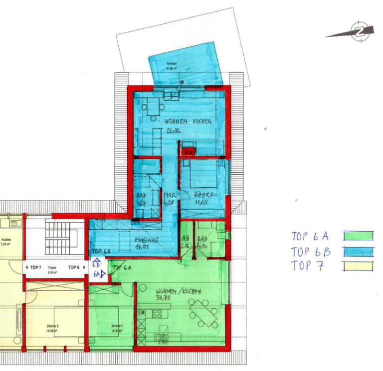 Optional kann diese Wohnung auch in 2 Wohnungen mit 53 m2 und 55 m2 aufgeteilt werden.